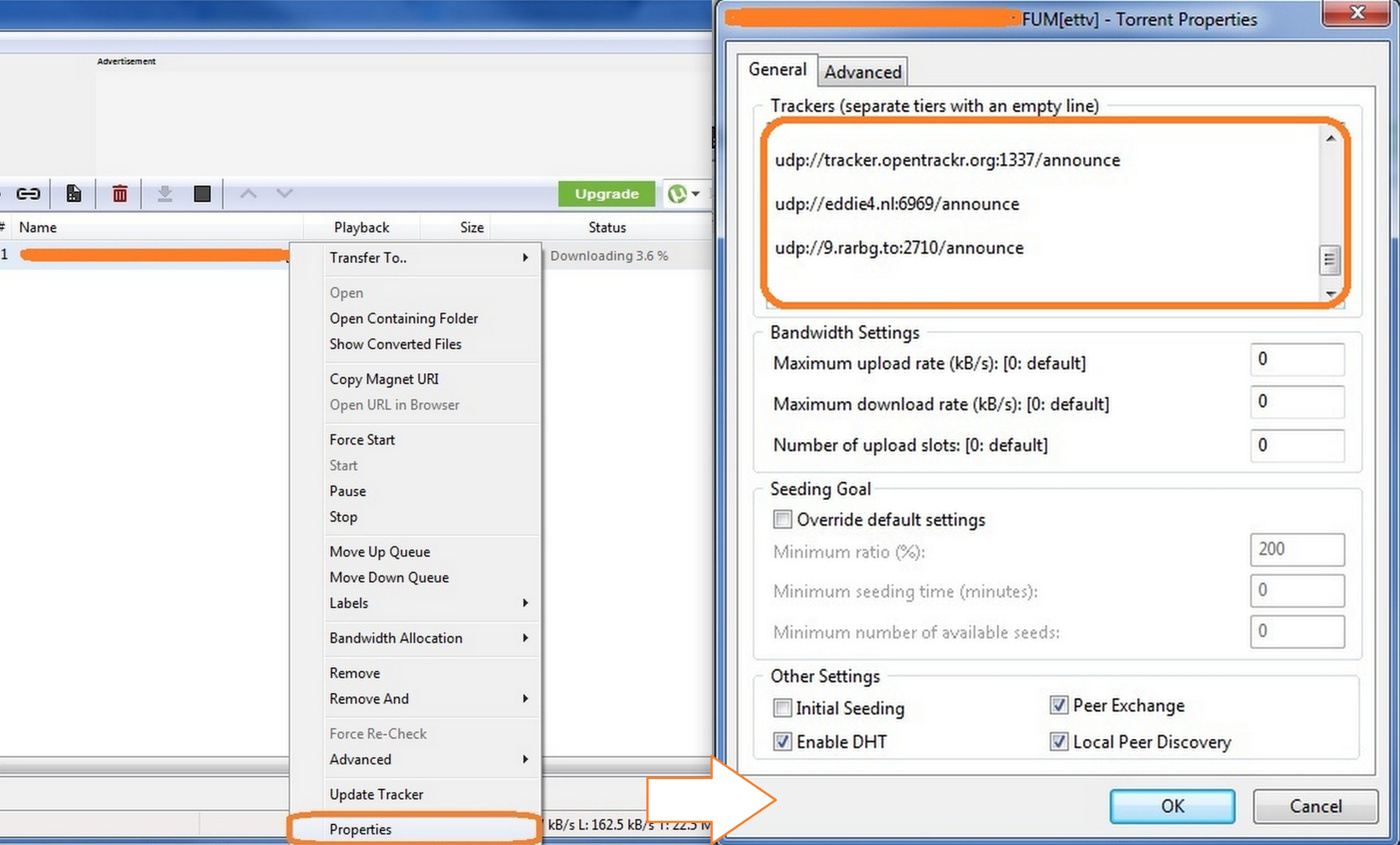 要添加新的跟蹤器,首先右鍵單擊您正在下載的 torrent,然后選擇屬性。在常規(guī)選項(xiàng)卡下,您將找到跟蹤器列表。滾動(dòng)到底部并從下面給出的列表中粘貼跟蹤器。