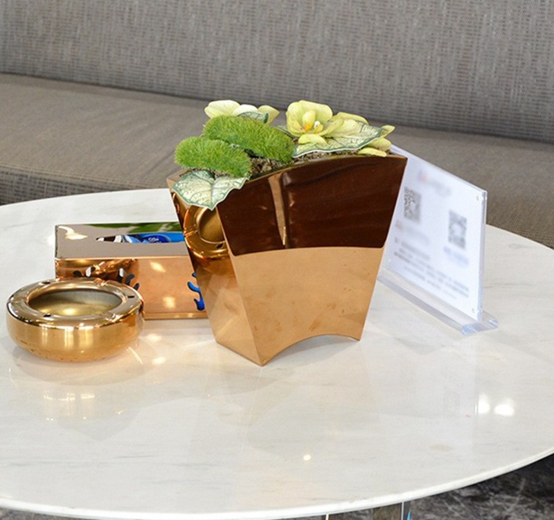 不銹鋼的特點(diǎn)是容易造型,可以打造各種異形的不銹鋼花箱。金色的或者玫瑰金顏色的不銹鋼花箱最能體現(xiàn)奢華高檔的裝修風(fēng)格。所以很多星級(jí)酒店,高檔會(huì)所都喜歡用不銹鋼花箱放在桌子上作為裝飾品,在花箱上面放置一些假花和假山,營(yíng)造出一種低調(diào)高端的居住環(huán)境。
