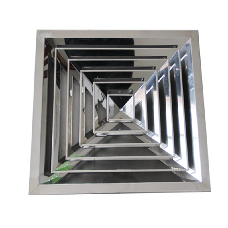 方形散流器為不銹鋼制做,表面經(jīng)過(guò)不銹鋼拋光處理。也可按用戶(hù)要求進(jìn)行烤漆或靜電噴塑,顏色按用戶(hù)選擇。還可以按用戶(hù)要求配上調(diào)節(jié)閥或過(guò)濾網(wǎng)。方形散流器有四面吹,三面吹,二面吹等幾種出風(fēng)形式。三面吹散流器適于安裝在靠墻較近的天花板上,二面吹散流器適于安裝在墻角附近的天花板上,用戶(hù)可根據(jù)安裝位置選用不同出風(fēng)方向的散流器。