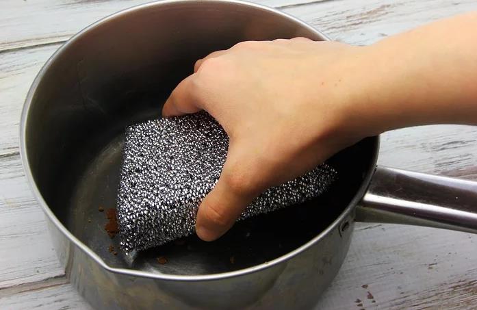 - 用海綿擦拭清潔劑。涂抹清潔劑約60秒后,蘸濕海綿。沿著不銹鋼顆粒的方向擦拭生銹的斑點。