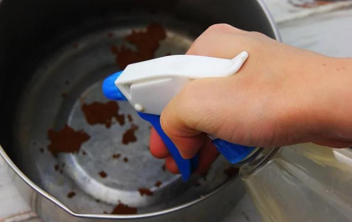 - 沖洗生銹的區(qū)域。例如,如果它在您的水槽中,請將水倒在上面。如果生銹在垂直表面上,請使用裝滿水的噴霧瓶并將其噴灑