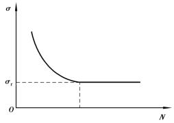 許多機械零件如彈簧、軸、齒輪等,在工作時承受交變載荷,即使交變應(yīng)力低于屈服強度,經(jīng)過一定循環(huán)次數(shù)后也會發(fā)生破壞。試驗證明,金屬材料能承受的交變應(yīng)力σ與斷裂前應(yīng)力循環(huán)次數(shù)N有如圖1.1.3所示的關(guān)系。由圖可知,當σ低于某一值時,曲線與坐標平行,表示材料可經(jīng)無限次循環(huán)而不斷裂,這一應(yīng)力稱為疲勞強度或疲勞極限σr。