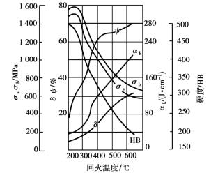 圖1.4.23 40鋼回火溫度對力學性能的影響