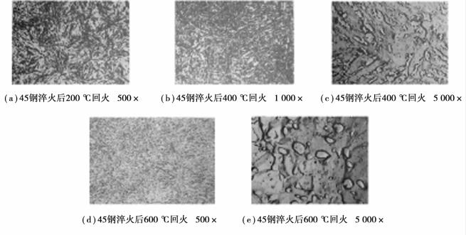 在100℃以上回火,馬氏體就開始分解。馬氏體中的碳以ε-Fe2.4 C的形式析出,使過飽和度降低。到350℃左右時,α相中含碳量降至接近平衡濃度,馬氏體分解基本結束。但此時α相仍保持針狀特征。這種由極細的ε-Fe2.4 C和低過飽和度的α相組成的組織,稱為回火馬氏體,因易腐蝕,顏色較暗,如圖1.4.21(a)所示。