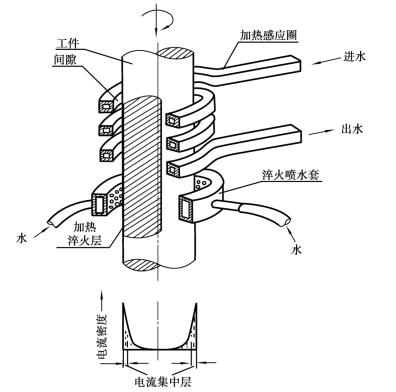 這種表面淬火法的原理如圖1.4.24所示。把工件放入由空心銅管繞成的感應圈(線圈)中,通入一定頻率的交變電流以產生交變磁場,于是在工件中便產生同頻率的感應電流。由于高頻電流的集膚效應,表面電流密度極大,心部電流密度小,因此可使工件表層迅速加熱到淬火溫度,在隨即的噴水(合金鋼浸油)快速冷卻后,就達到了表面淬火的目的。而心部溫度很低,并未淬火,仍保持原來的組織和性能。