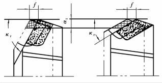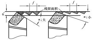 的作用是為了減小副切削刃與工件已加工表面之間的摩擦,以防止切削時產(chǎn)生震動。副偏角的大小影響刀尖強(qiáng)度和已加工表面的粗糙度。如圖5.1.13所示,在切深、進(jìn)給量一定的情況下,減小副偏角可使殘留面積減小,表面粗糙度降低。