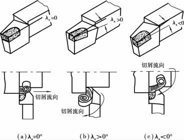 刃傾角λs主要影響刀尖的強(qiáng)度和切屑流動的方向。如圖5.1.14所示,λs= 0°時,切屑向著與主切削刃垂直的方向流動;λs>0°時,切屑向著待加工表面方向流動;λs<0°時,切屑向著已加工表面方向流動。