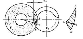 圖5.2.69所示為外圓磨切削厚度示意圖,砂輪由A點切入工件,至B點切出,工件相應由B點轉到C點。這一瞬間磨去的金屬層為ABC,磨層的最大厚度為CC1。由圖可知,在砂輪速度V不變的前提下,增加磨削深度αp和工件圓周進給速度V w,則切削厚度增大,生產率提高。